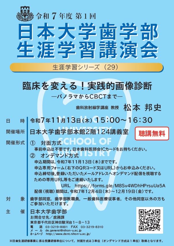 オンデマンド配信の視聴希望者は、こちら(https://www.dent.nihon-u.ac.jp/for-alumni/lifelong_learning/)からお申込みください。